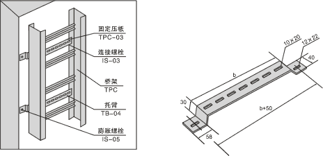 TB-04型托臂适用于各种形式桥架在垂直引上、引下或过梁时固定用。